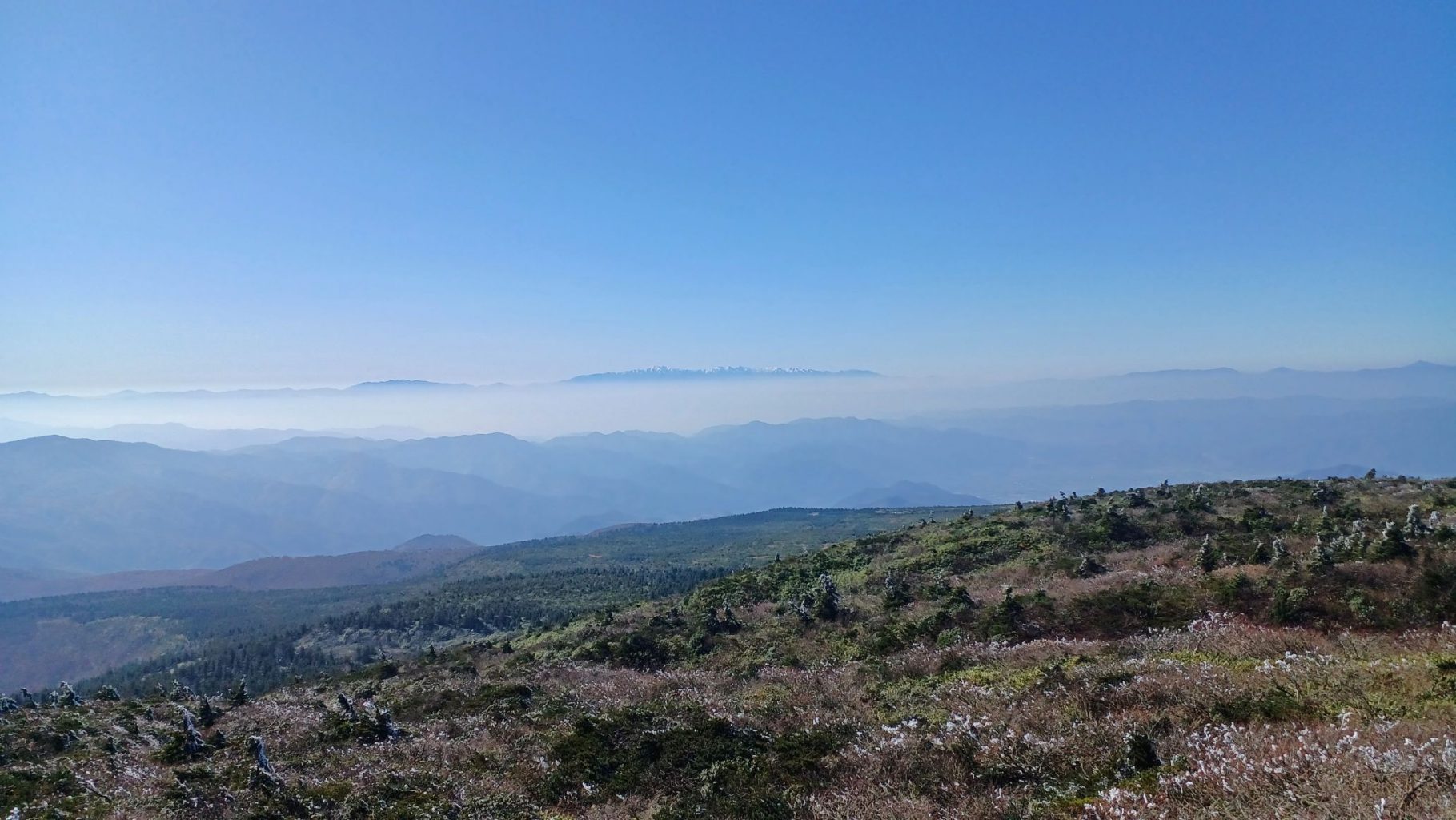 山形県側、朝日連峰等が遠くの雲の上に顔をのぞかせています。