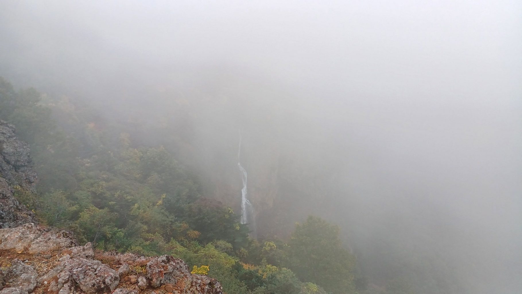 滝見台から眺めた「三階滝」「不動滝」では、滝周辺が散り初め落葉に近づき、灰色になっているように見えます。