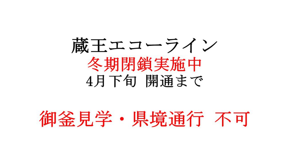 【 11/ 4~ 4月下旬まで冬期通行止】 「御釜見学」と「宮城県境の通り抜け」はできません。 「蔵王エコーライン・蔵王ハイライン」道路交通情報 ※ 随時更新