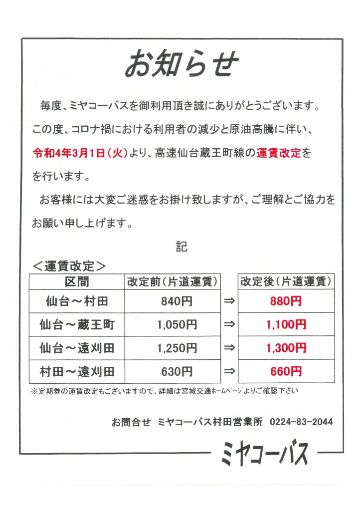 高速バス 仙台~村田~蔵王町線の運賃改正が2022年3月1日より行われます。