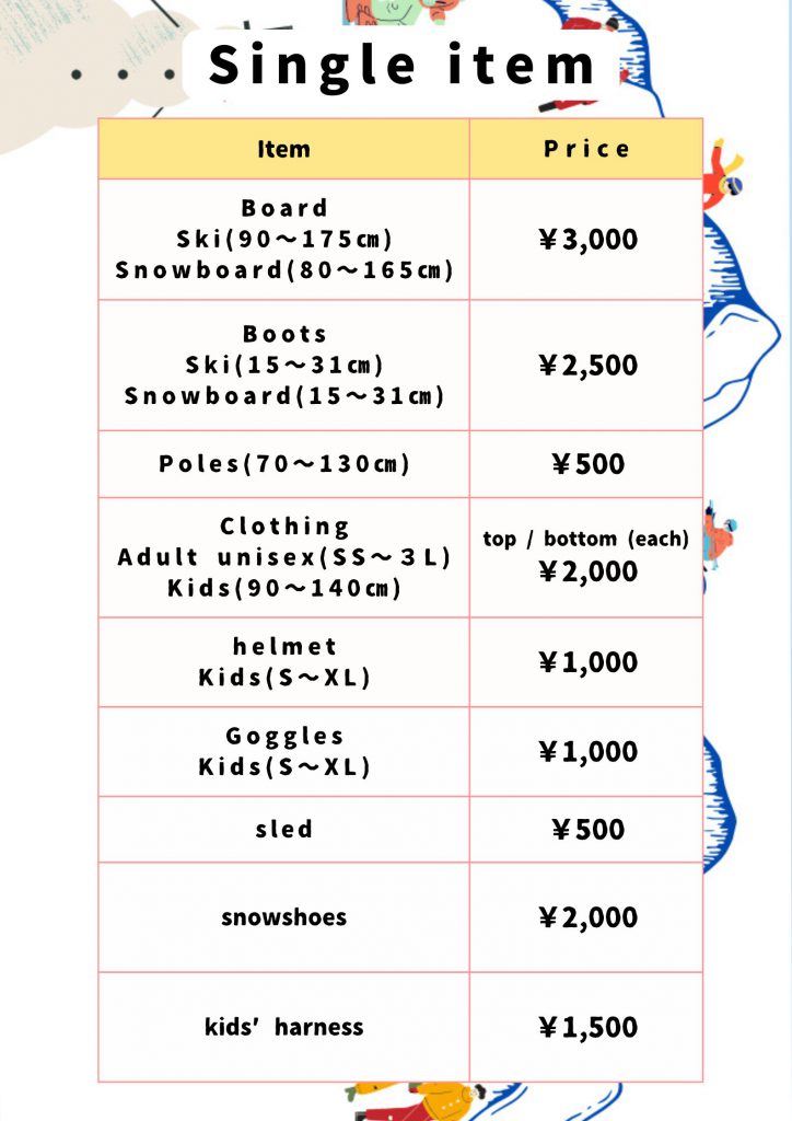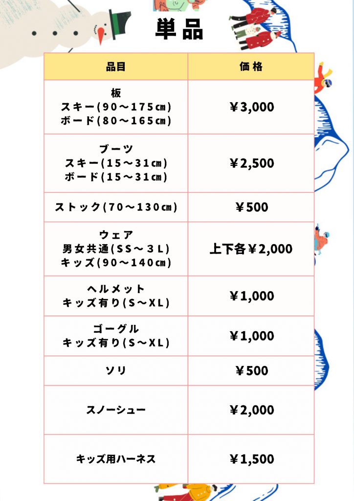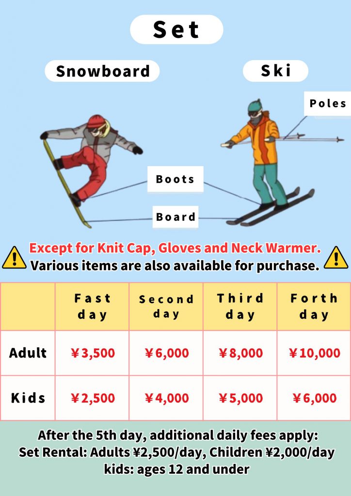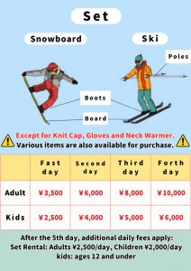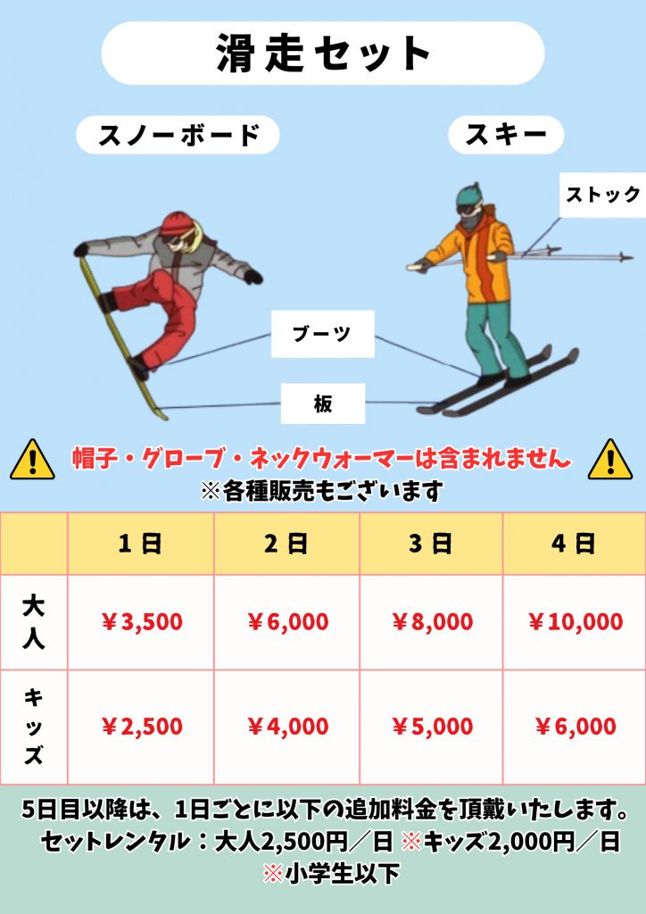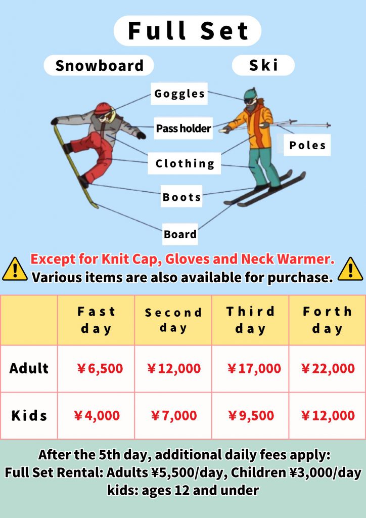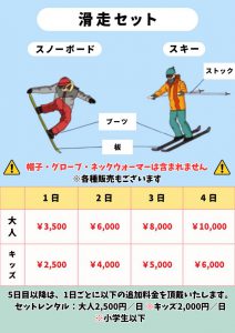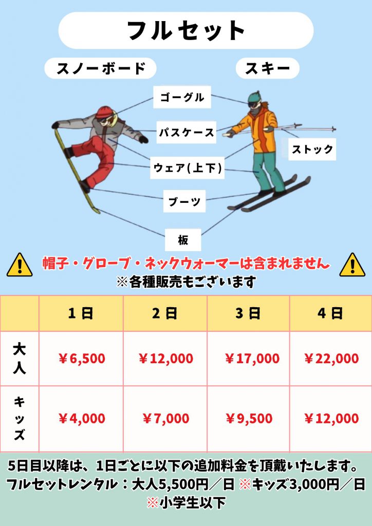 • ウェア、ゴーグル、パスケースがついた充実のフルセットをご用意してます。